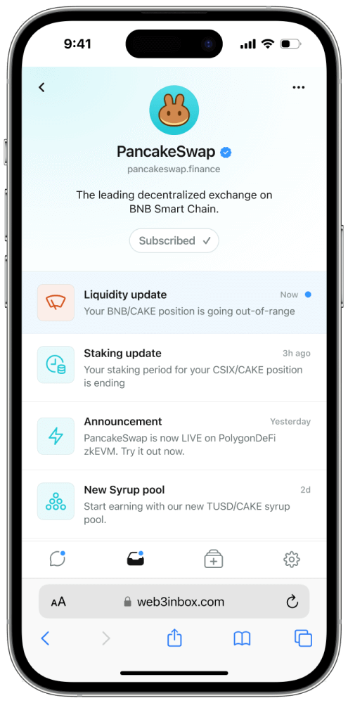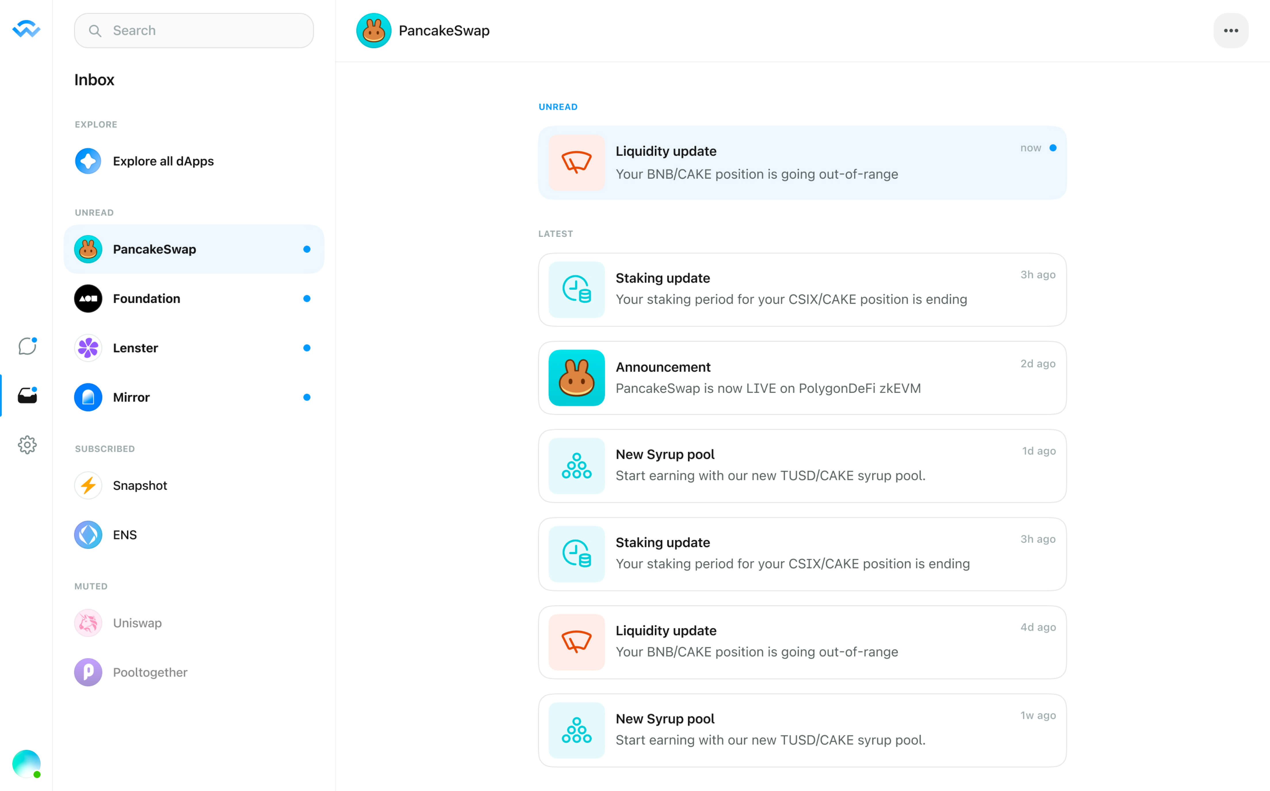 Avoid missing out on the things that matter - like project updates, DAO proposals, and NFT drops - when you subscribe to available dapps.